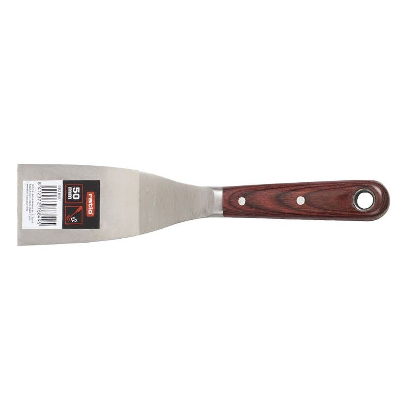 Espátula de Pintor RATIO Acero Inoxidable Herramienta imprescindible para cualquier trabajo de pintura, restauración o bricolaje. Diseñada con una hoja de acero inoxidable flexible y pasante hasta el mango, garantiza resistencia, durabilidad y precisión en cada aplicación. Su espesor de 1,5 ~ 0,5 mm permite un manejo versátil, ideal para extender masillas, alisar superficies o raspar pintura vieja sin esfuerzo. El mango de madera de 105 mm, ergonómico y de tacto cómodo, proporciona un agarre firme para un control total en el trabajo. Perfecta tanto para profesionales como para aficionados al bricolaje, esta espátula combina calidad y funcionalidad para lograr acabados impecables en cualquier proyecto. ¡Un básico en tu caja de herramientas!