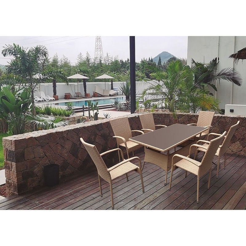 La silla está construida con una estructura metálica combinada con ratán sintético plano, lo que ofrece durabilidad y resistencia a la intemperie, asegurando su uso prolongado en exteriores.